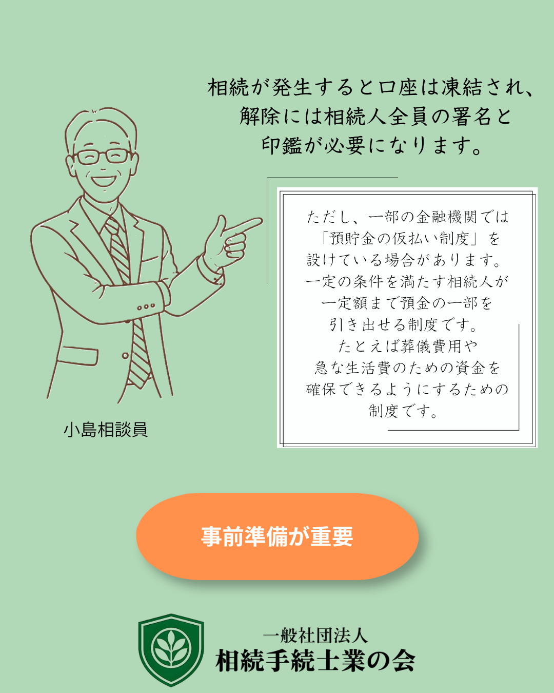 お亡くなりになられた方の銀行口座は、原則として「凍結」されます。